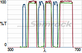 This blue-green-orange multiband filter set is uniquely optimized to provide simultaneously stunning brightness, striking contrast, and superb color balance when viewing multiple fluorophores by eye or with a high-quality color CCD camera. The result is brilliant colors and a black background.